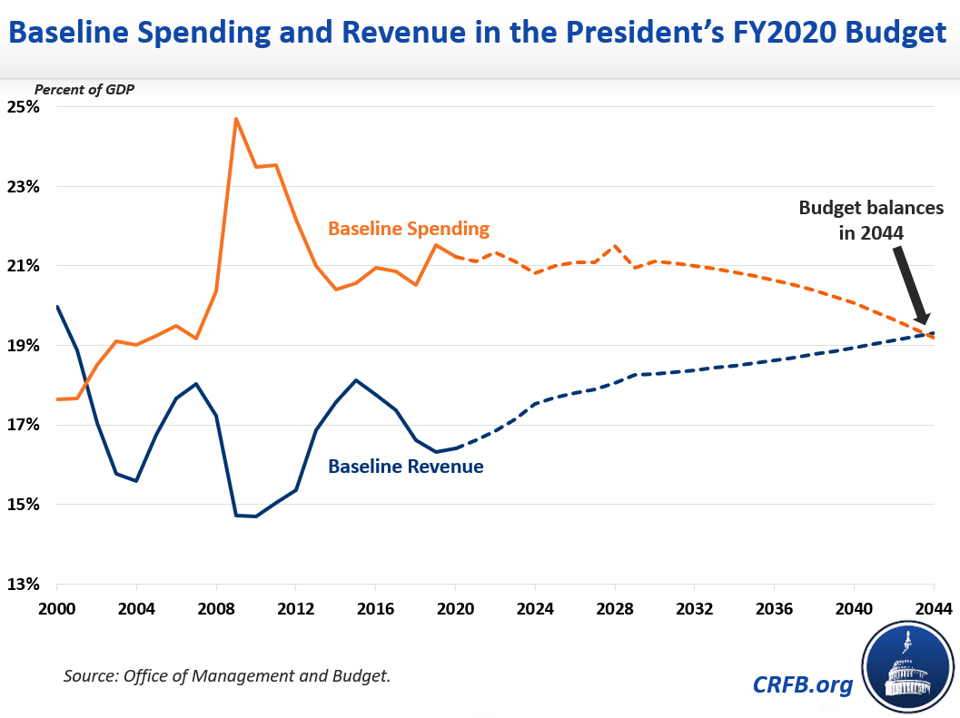 The Administration's long-term budget outlook shows the budget would reach balance within 25 years under its baseline. In other words, absent any spending cuts or tax increases – and assuming the $300 billion per year extension of the 2017 tax cuts – the budget will reach balance. Meanwhile, debt as a share of GDP under the Administration's baseline will peak at over 83 percent in 2023 and then fall continuously, to below 58 percent of GDP by 2044.